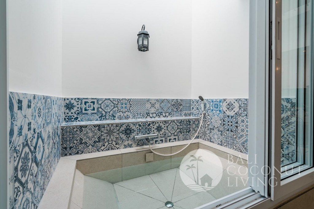 This elegant two-storey villa in Cemagi offers a comfortable living experience surrounded by a peaceful environment. The villa consists of two bright bedrooms with large arched windows that allow plenty of natural light, each equipped with ensuite bathrooms featuring modern fittings and a sleek design. The enclosed living and dining area connects to a kitchen finished with black marble countert