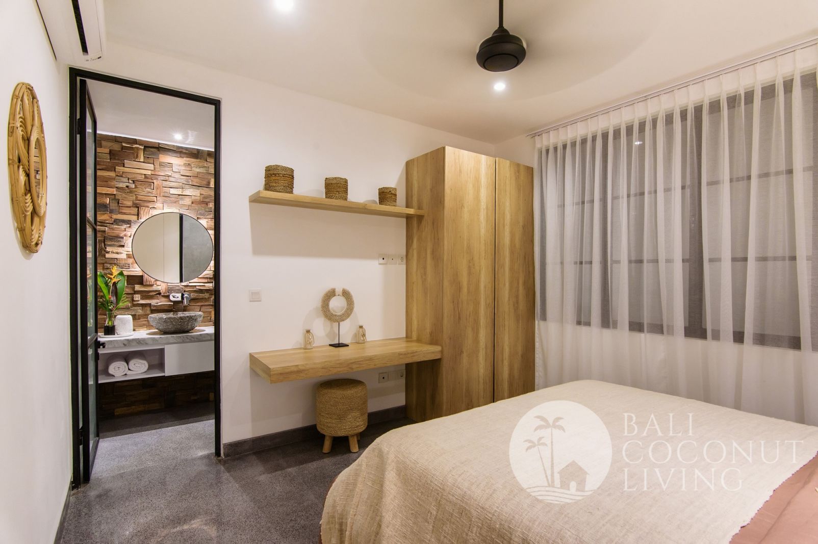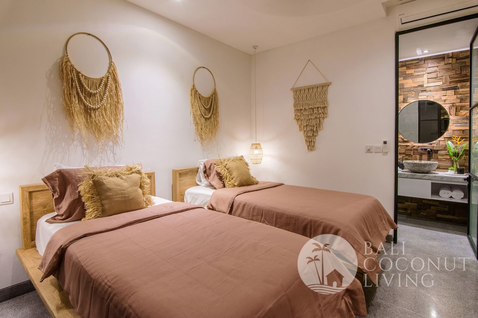 This lovely modern villa is perfectly situated in a peaceful residential area of Sanur, offering a comfortable and stylish living space. Designed with a clean contemporary style and warm natural tones, the villa features two cozy bedrooms, two bathrooms, an enclosed living area, and a fully equipped kitchen with a sleek breakfast bar, ideal for small families or couples looking for a practical y