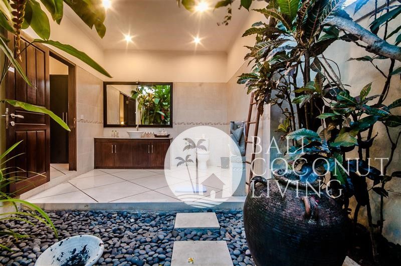 This stylish 3 bedroom, 3 bathroom villa in the heart of Berawa offers a perfect balance of comfort, functionality, and modern tropical living. Built on 200 sqm of land, the property features a well-designed layout with an enclosed living area, creating a cool and private indoor space ideal for both relaxation and everyday living. Large glass doors and windows allow natural light to flow in while
