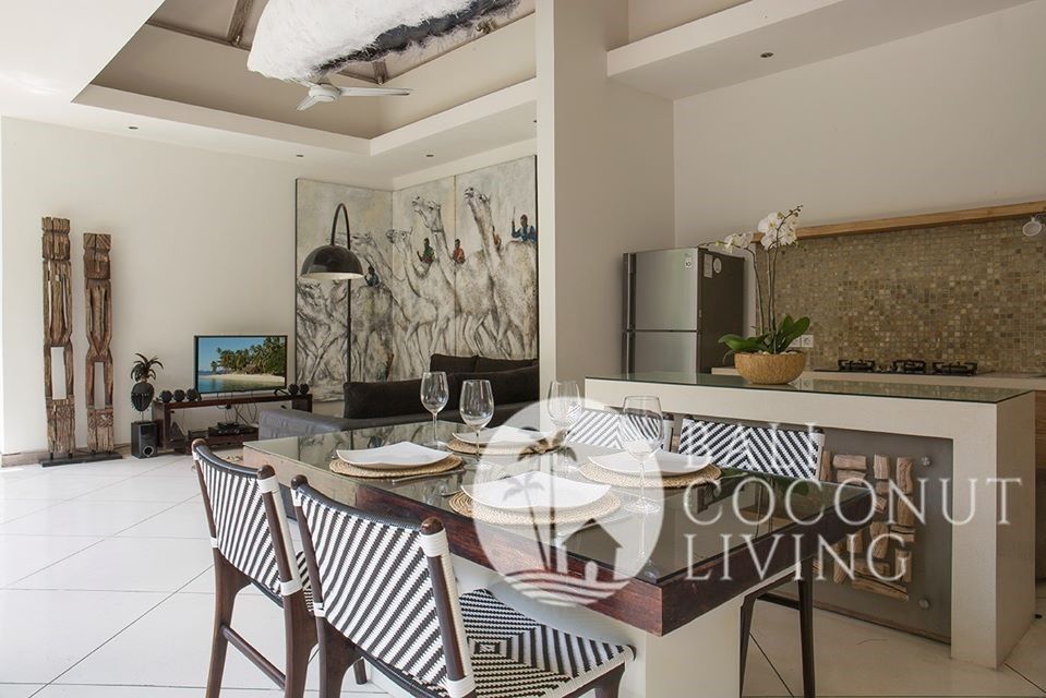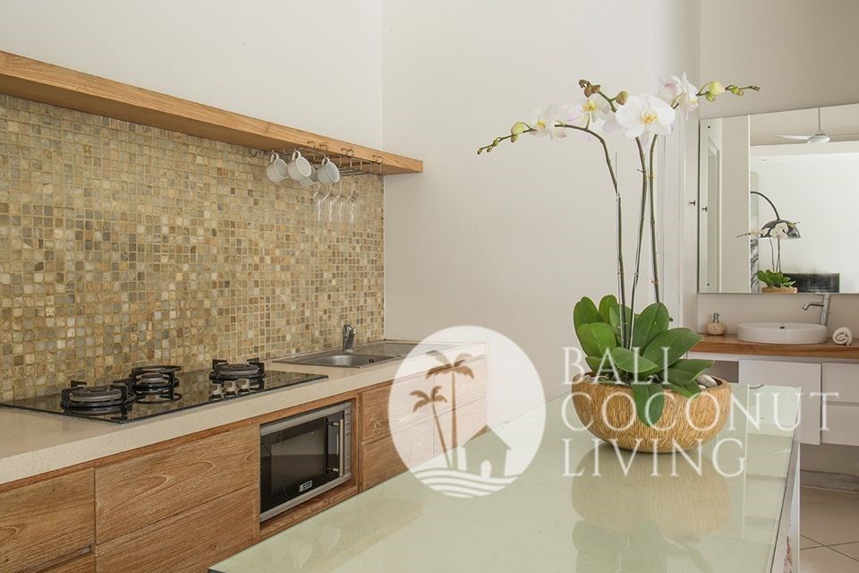 This stunning 2 bedroom villa is located in the beautiful and peaceful village of Kayu Tulang, just a short drive from the bustling Canggu central. The property sits on a spacious 100 sqm of land and boasts a modern and stylish design with high-end finishes and fixtures throughout. The enclosed living and dining area is flooded with natural light. The fully equipped kitchen features top-of-the-lin