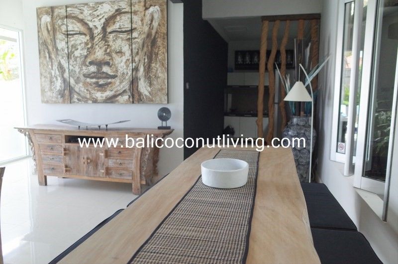 This cozy 2 bedroom villa in Berawa offers a perfect blend of modern design and comfortable living. Set on 100 sqm of land, the property features a clean architectural style with warm wooden accents and large windows that invite plenty of natural light, creating a bright and welcoming atmosphere throughout the home. Inside, you’ll find a cozy enclosed living area that seamlessly connects to t
