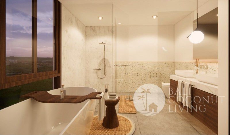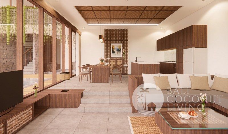 This modern 3-bedroom villa in Babakan offers a perfect blend of contemporary design and comfortable living, set on 250 sqm of land with a spacious 350 sqm building. Designed with a closed living concept, the interiors feature clean lines, soft neutral tones, and large glass windows that allow natural light to flow seamlessly throughout the space. The sunken lounge, sleek fully equipped kitchen, a