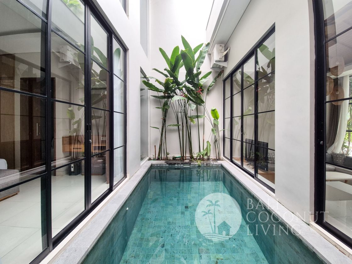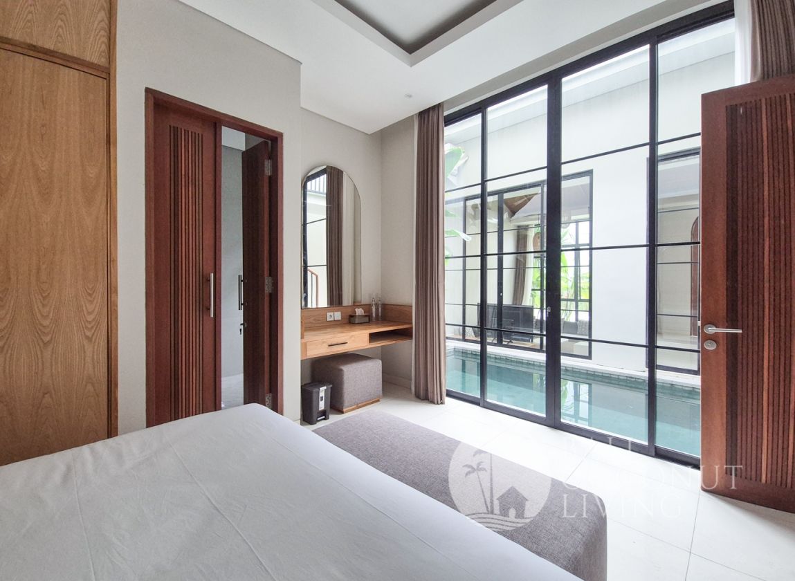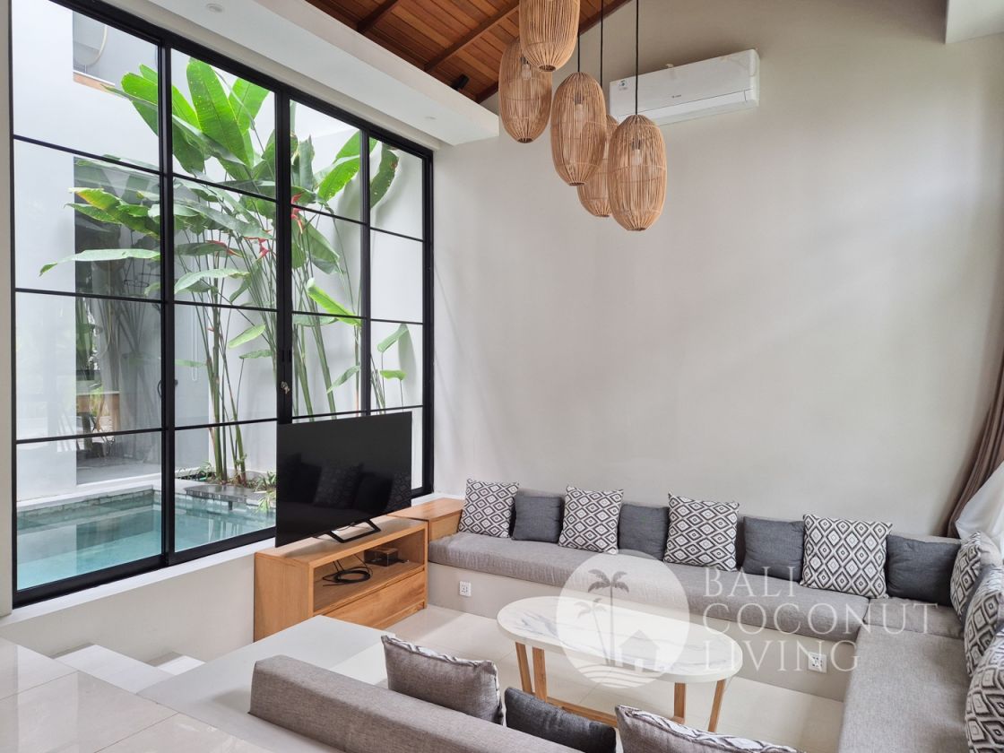 Escape to this chic and modern two-story villa, perfect for travelers seeking privacy and style. The exterior features a distinctive Balinese stone facade and a striking wooden arched entrance. Inside, the villa's unique design centers around a beautiful private plunge pool, visible and accessible from the living room and other areas through dramatic floor-to-ceiling black-framed windows. The sunken living area is bright and comfortable, while the bedrooms offer a serene retreat with crisp white linens, light wood accents, and modern lighting. This contemporary villa seamlessly blends stylish interior living, making it an ideal choice for a sophisticated and secluded Bali stay.