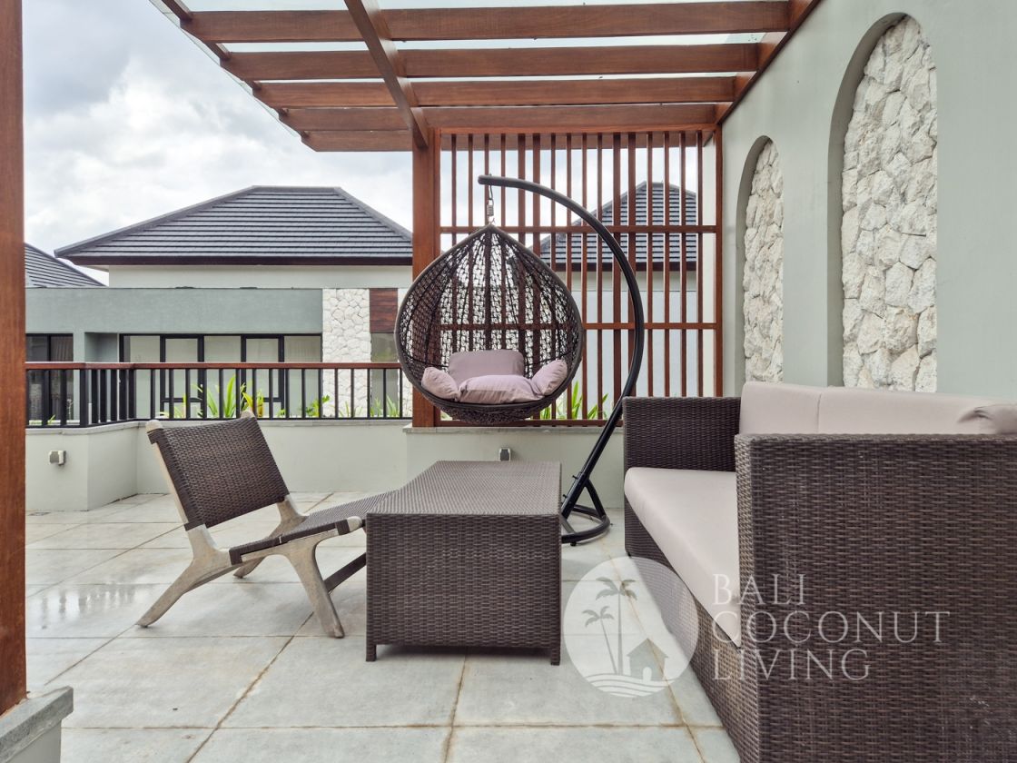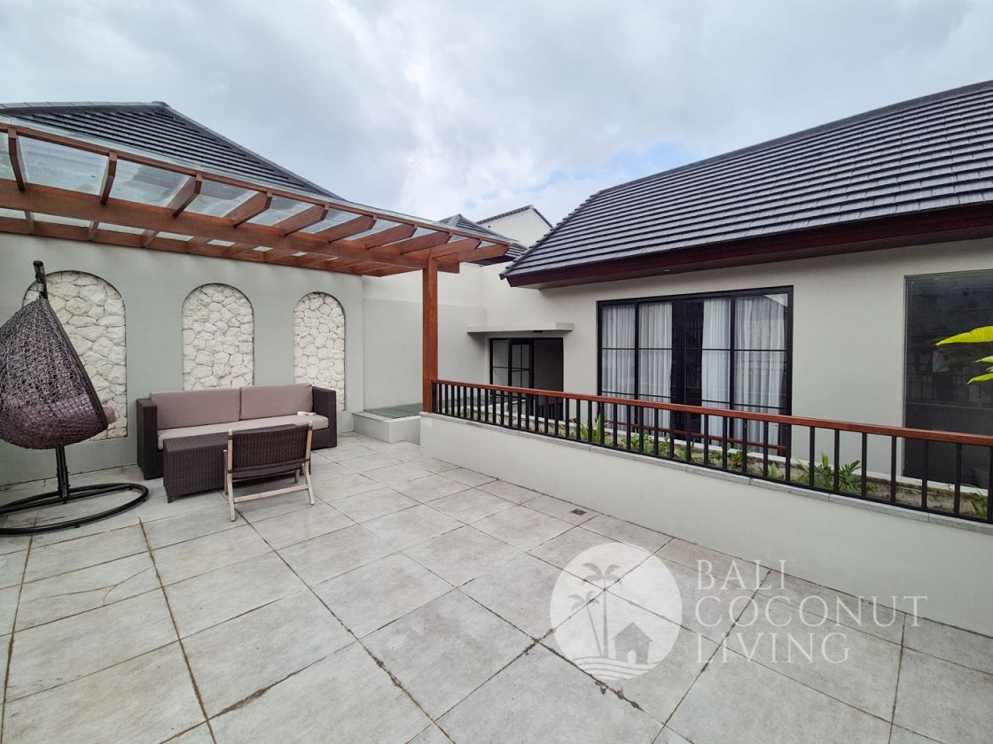 This cozy 3-bedroom family villa is nestled in the peaceful area of Canggu, perfect for those seeking comfort and tranquility. The villa features three en-suite bedrooms, an enclosed living and dining space, a spacious roof garden, and a large private swimming pool. Practical amenities include a service room, storage, laundry area, and convenient parking right on the property. Located just a 10
