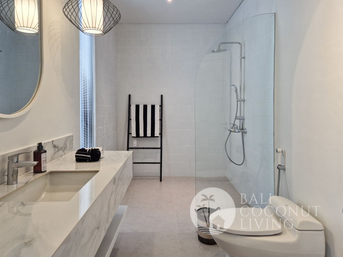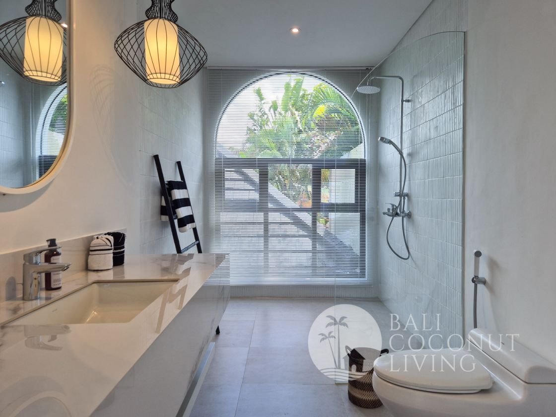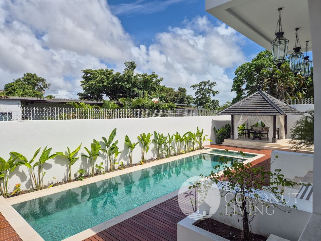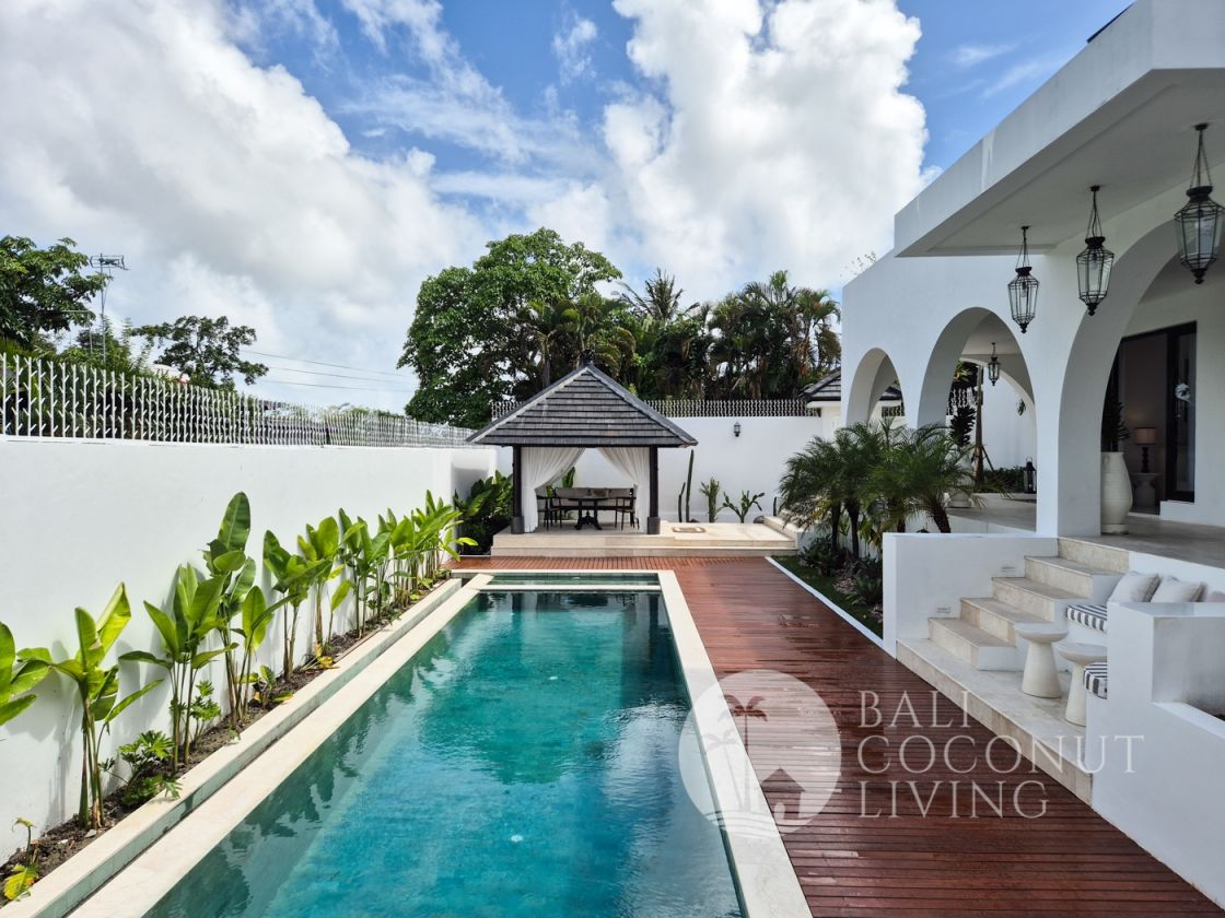 Outside, the private swimming pool becomes the centerpiece of the villa, surrounded by a spacious wooden deck and lush greenery, perfect for enjoying Bali’s sunny days. Whether for personal living or investment, this freehold property in the sought-after Berawa area presents an exceptional opportunity with a luxurious and tranquil living experience.