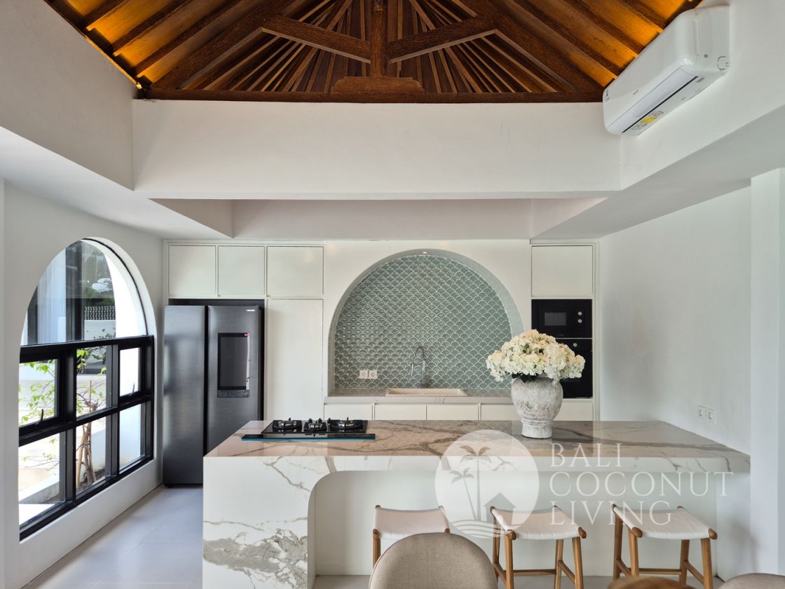 This beautifully designed 4 bedroom villa in Padonan offers a perfect blend of modern Mediterranean aesthetics and tropical comfort. Set on 400 sqm of land, the property features elegant architectural details such as arched windows, soft neutral tones, and clean lines that create a serene and sophisticated atmosphere throughout the home. The villa comes with a fully enclosed living area, though