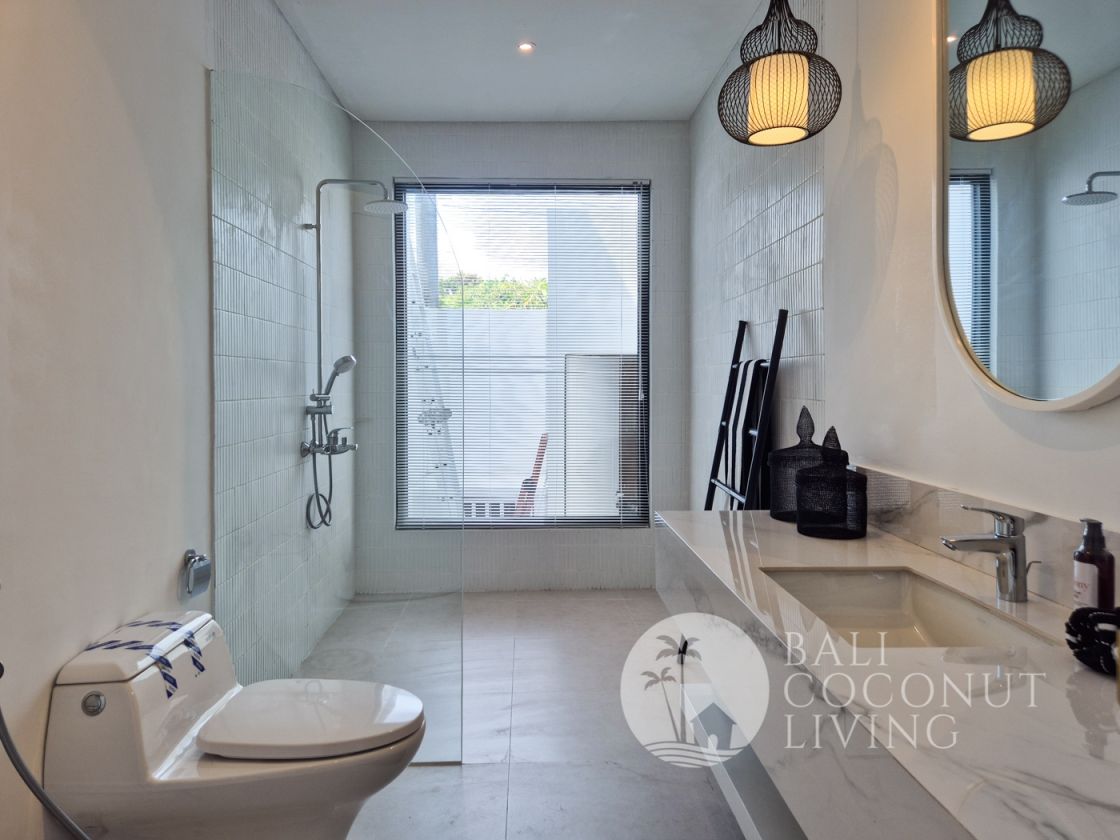 This cozy 2 bedroom villa in Berawa offers a perfect blend of modern design and comfortable living. Set on 100 sqm of land, the property features a clean architectural style with warm wooden accents and large windows that invite plenty of natural light, creating a bright and welcoming atmosphere throughout the home. Inside, you’ll find a cozy enclosed living area that seamlessly connects to t