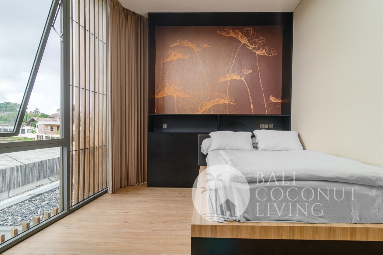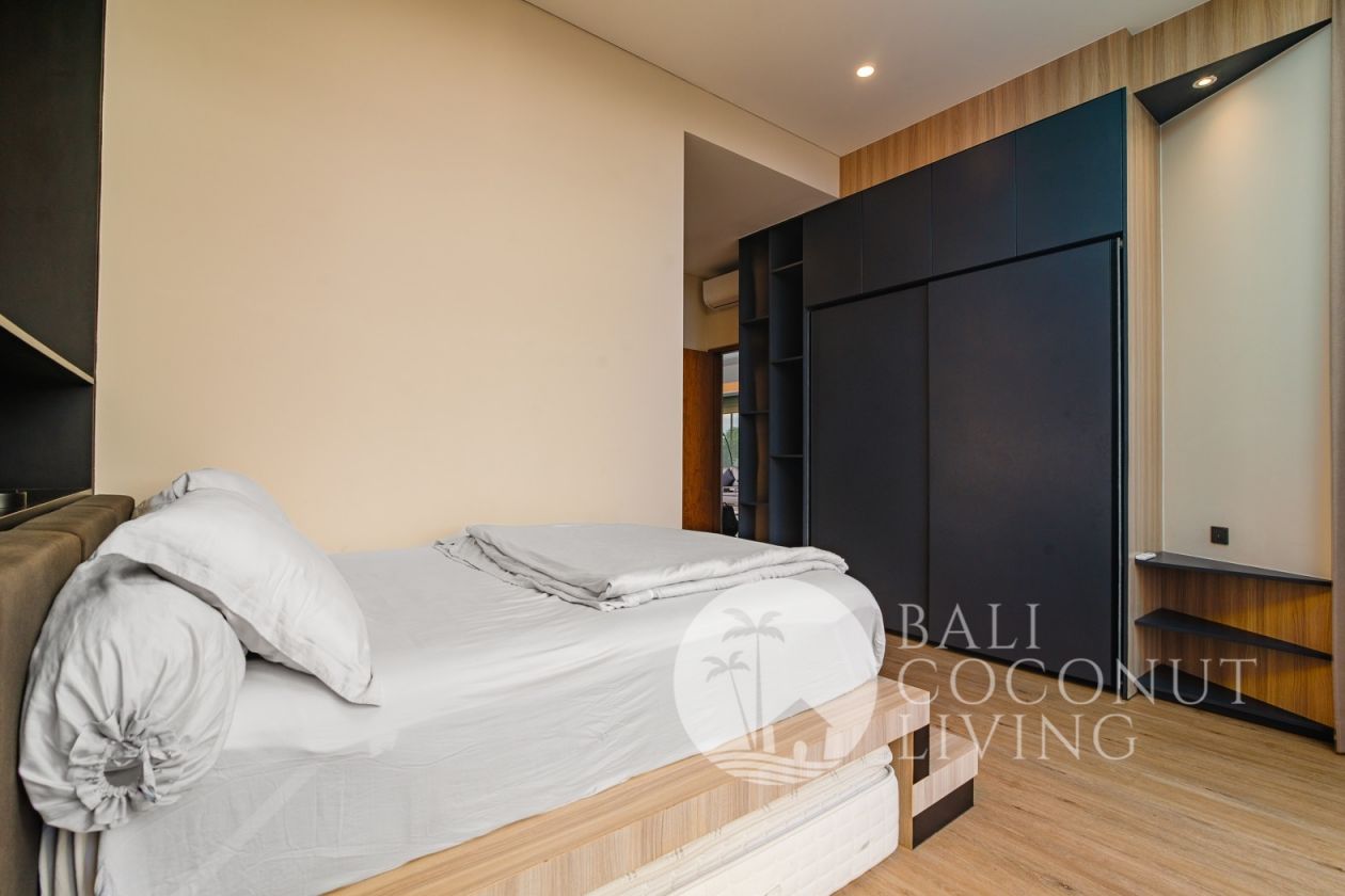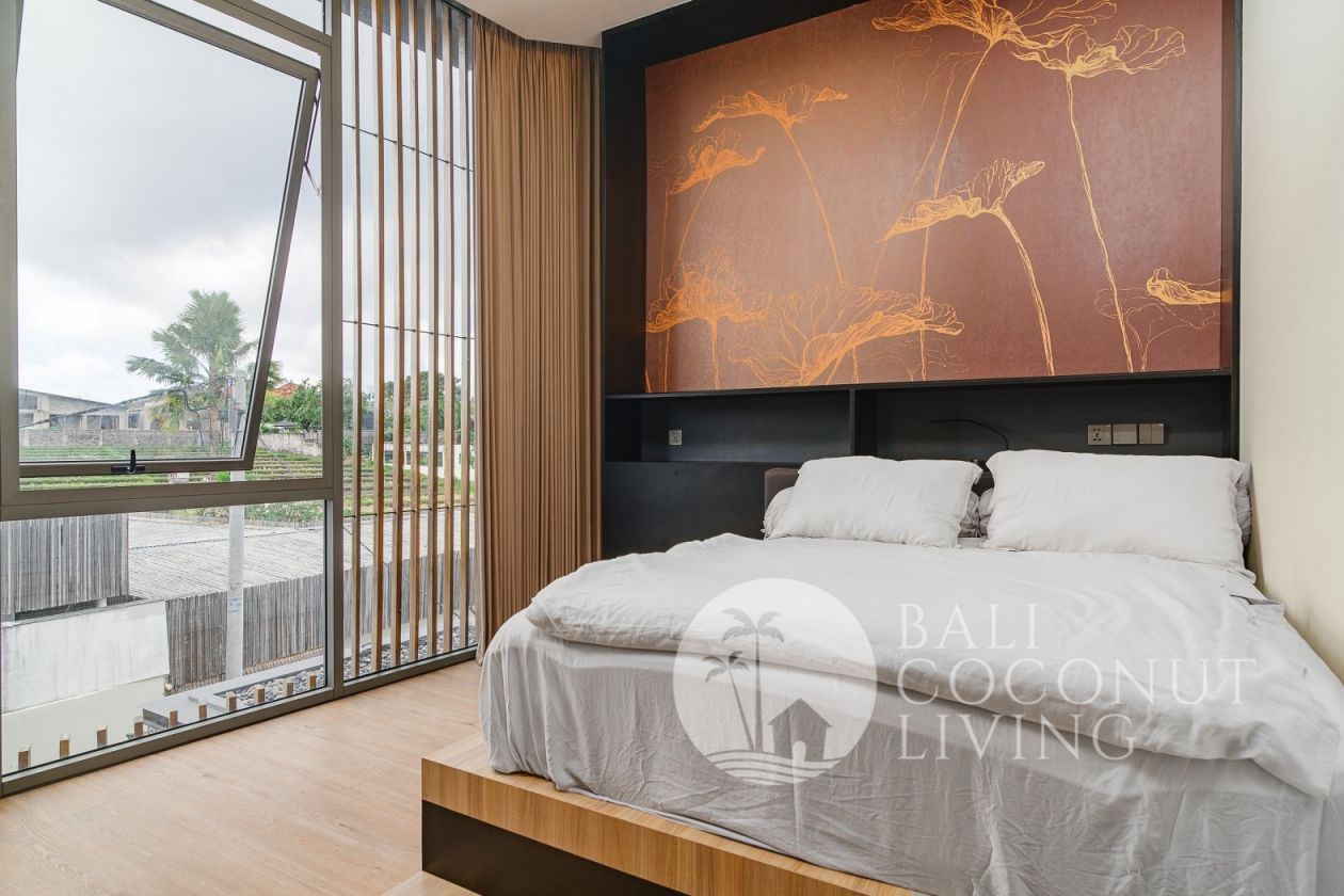 This elegant two-storey villa in Cemagi offers a comfortable living experience surrounded by a peaceful environment. The villa consists of two bright bedrooms with large arched windows that allow plenty of natural light, each equipped with ensuite bathrooms featuring modern fittings and a sleek design. The enclosed living and dining area connects to a kitchen finished with black marble countert