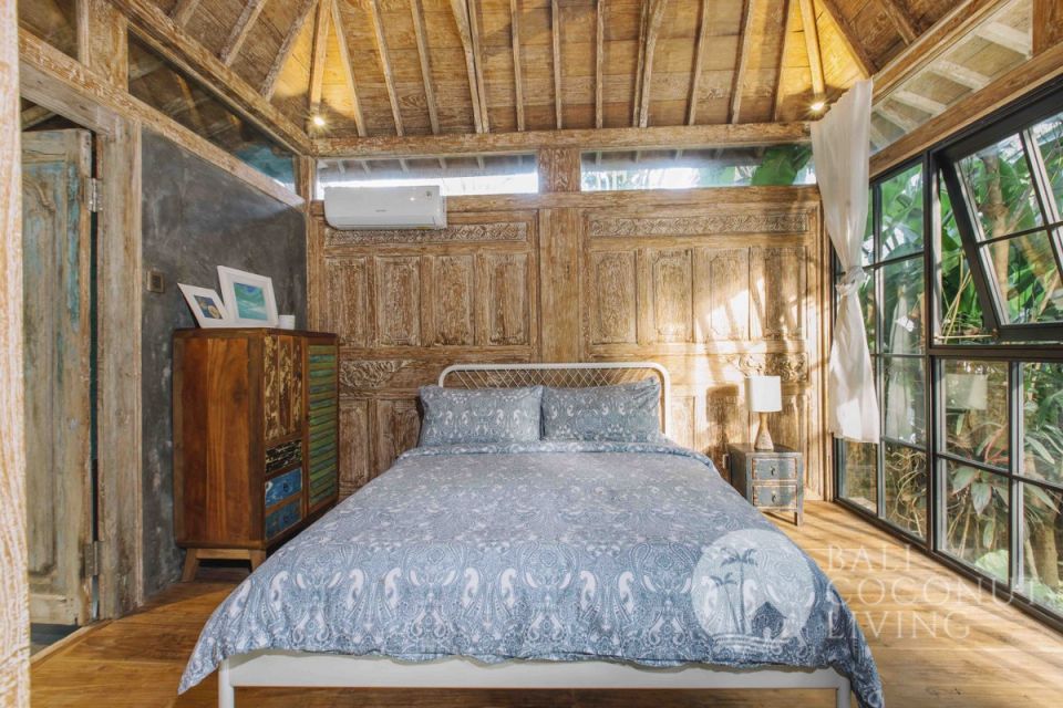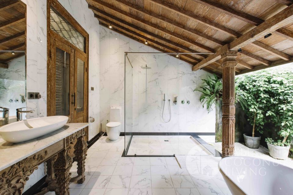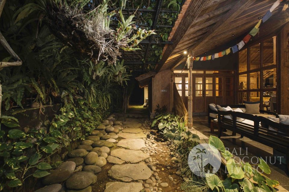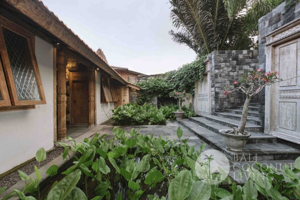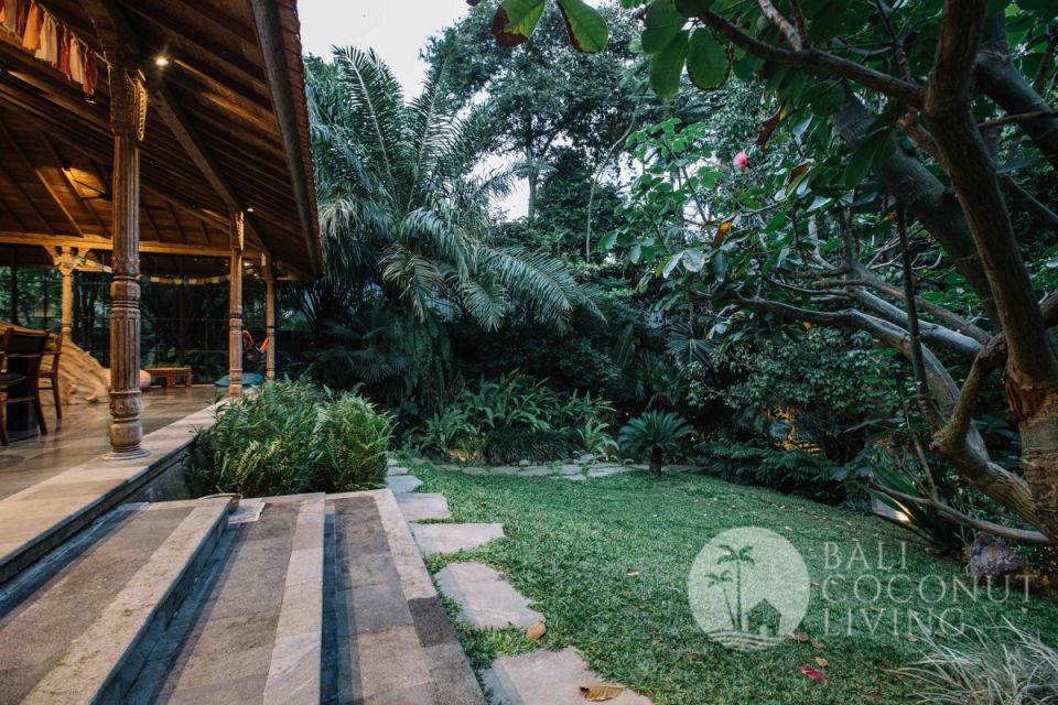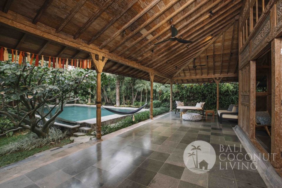 A luxury Joglo style villa nestled in a calm neighbourhood of Tumbak Bayuh, is on the market for yearly rental and sale. The property set on 2000 sqm block of land with 400 sqm of building. This generous property comprises 3 bedrooms with en-suite bathroom, equipped kitchen, a guest toilet, closed and open living, terrace, manicured tropical garden, pool, parking space.