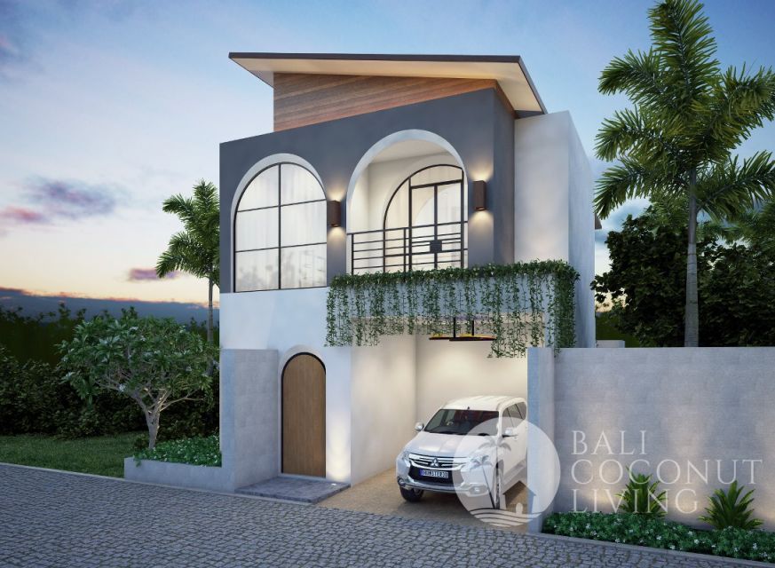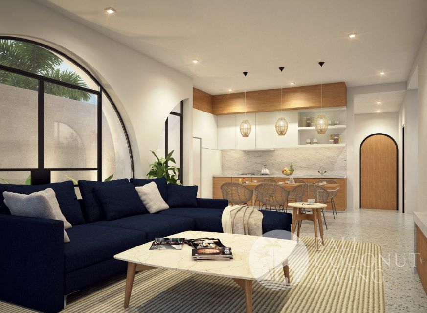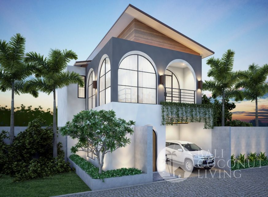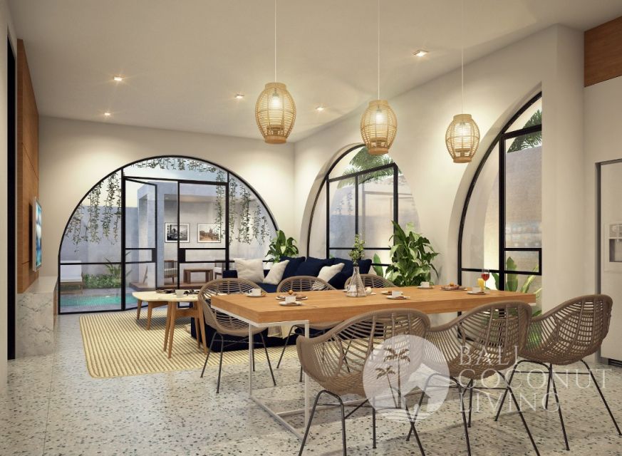 This elegant two-storey villa in Cemagi offers a comfortable living experience surrounded by a peaceful environment. The villa consists of two bright bedrooms with large arched windows that allow plenty of natural light, each equipped with ensuite bathrooms featuring modern fittings and a sleek design. The enclosed living and dining area connects to a kitchen finished with black marble countert