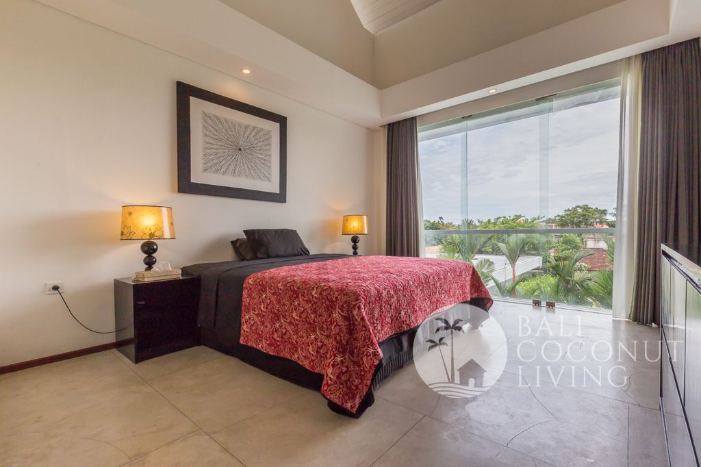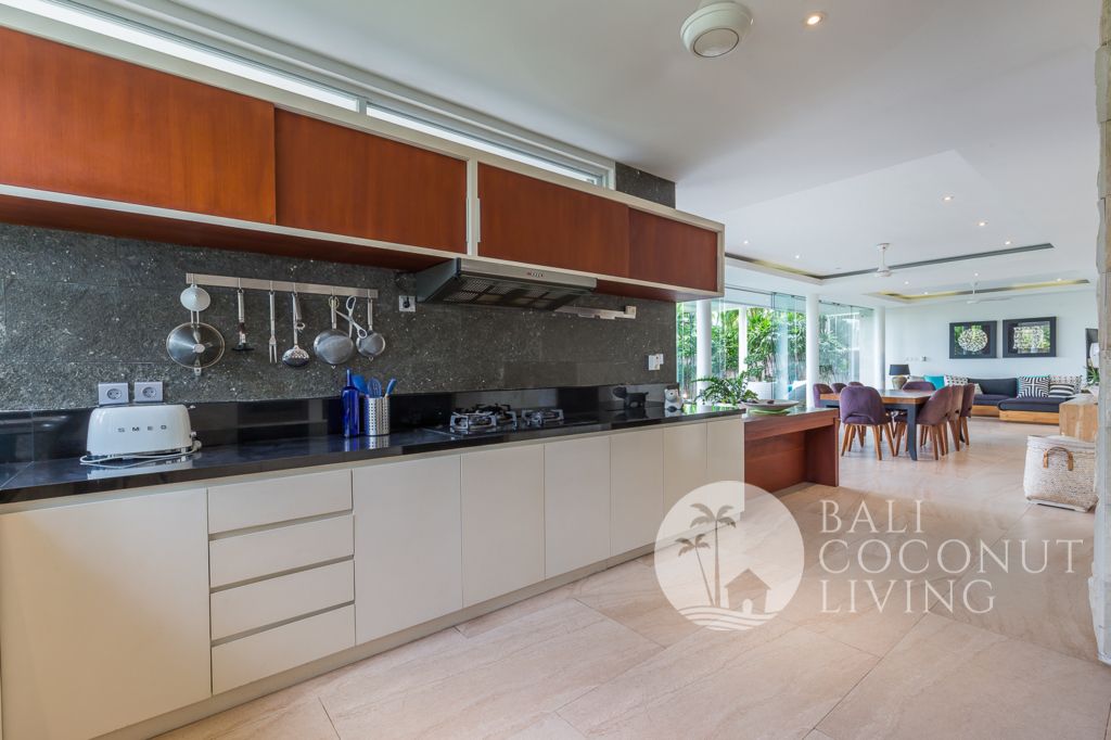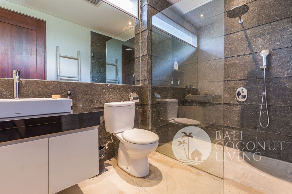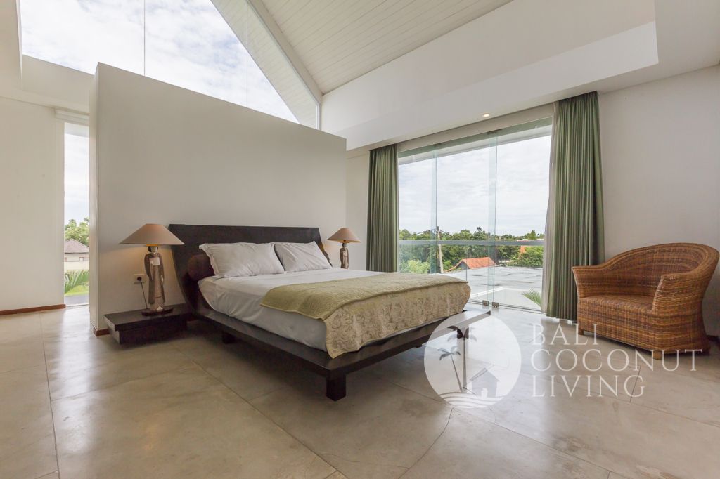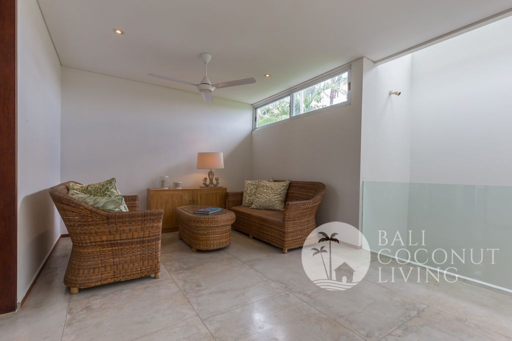 This elegant two-storey villa in Cemagi offers a comfortable living experience surrounded by a peaceful environment. The villa consists of two bright bedrooms with large arched windows that allow plenty of natural light, each equipped with ensuite bathrooms featuring modern fittings and a sleek design. The enclosed living and dining area connects to a kitchen finished with black marble countert