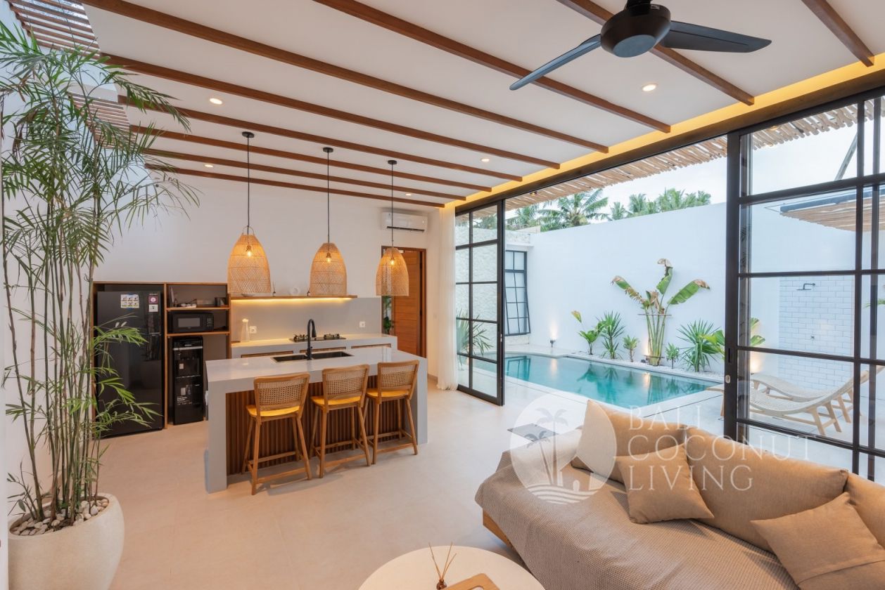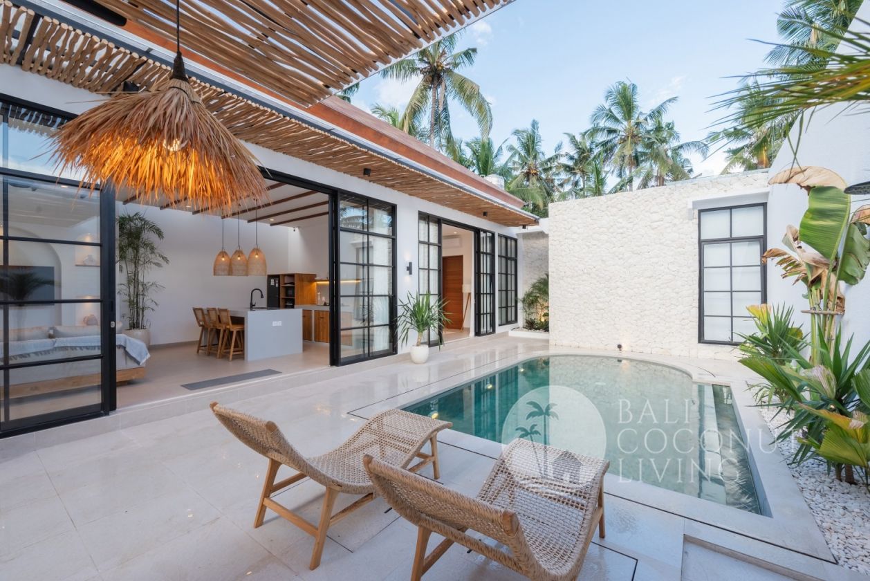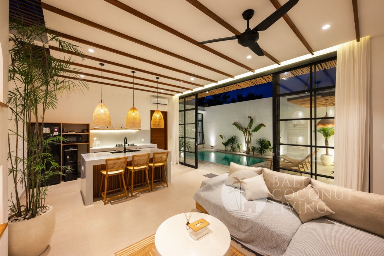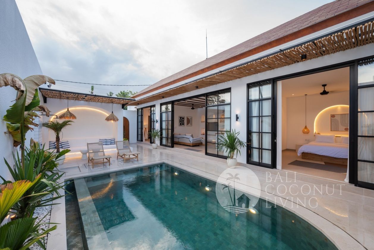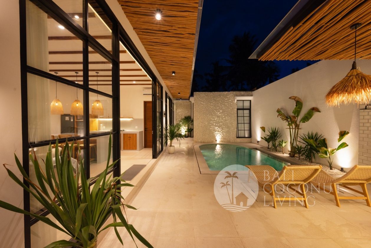 This stylish villa offers the perfect blend of comfort and modern living, located in the peaceful area of Tumbak Bayuh, just minutes away from the vibrant lifestyle of Canggu. Featuring 2 bedrooms with en-suite bathrooms, the villa is designed with a bright and airy layout, seamlessly connecting indoor and outdoor spaces. The enclosed living area opens directly to a private swimming pool with a