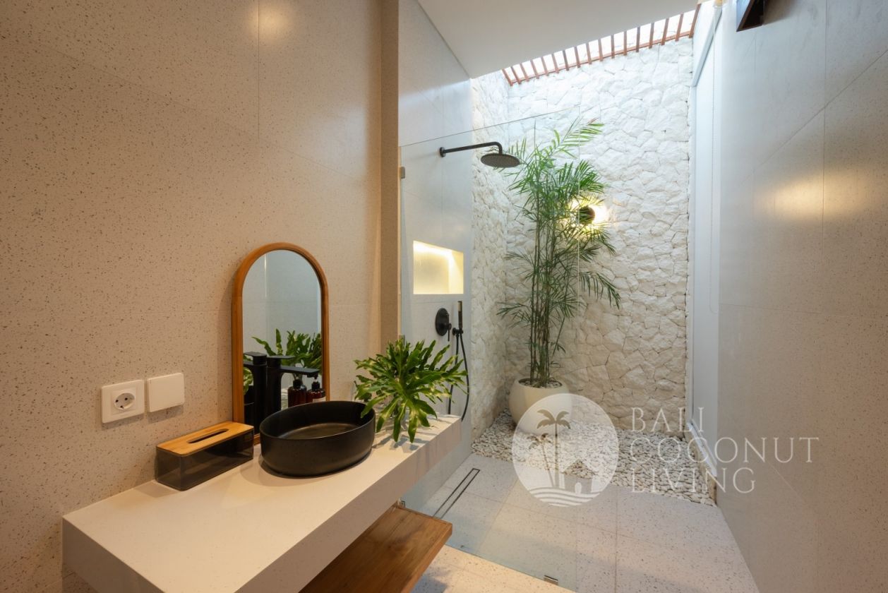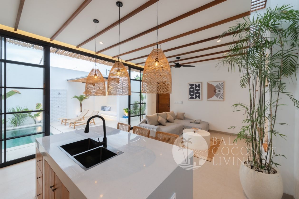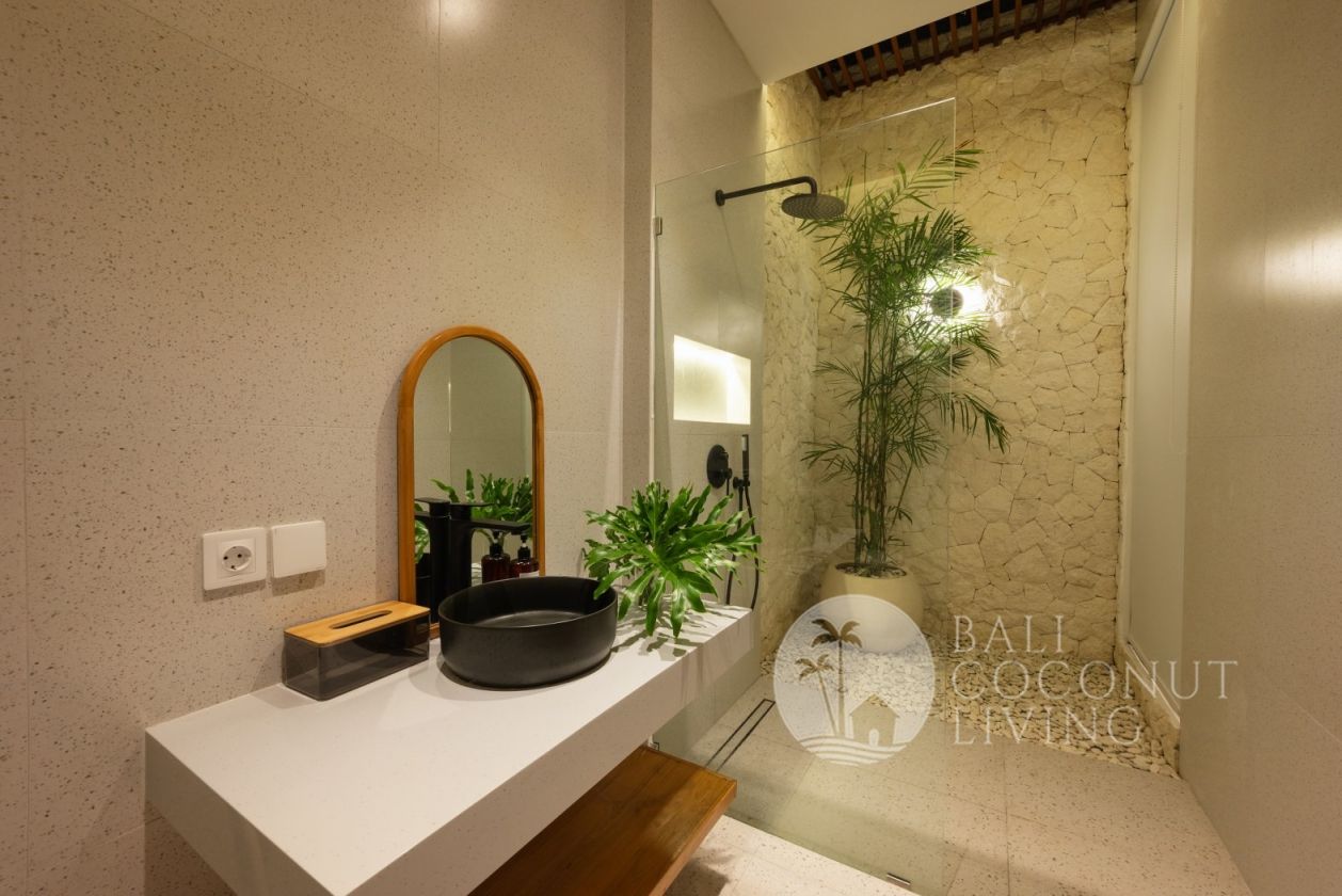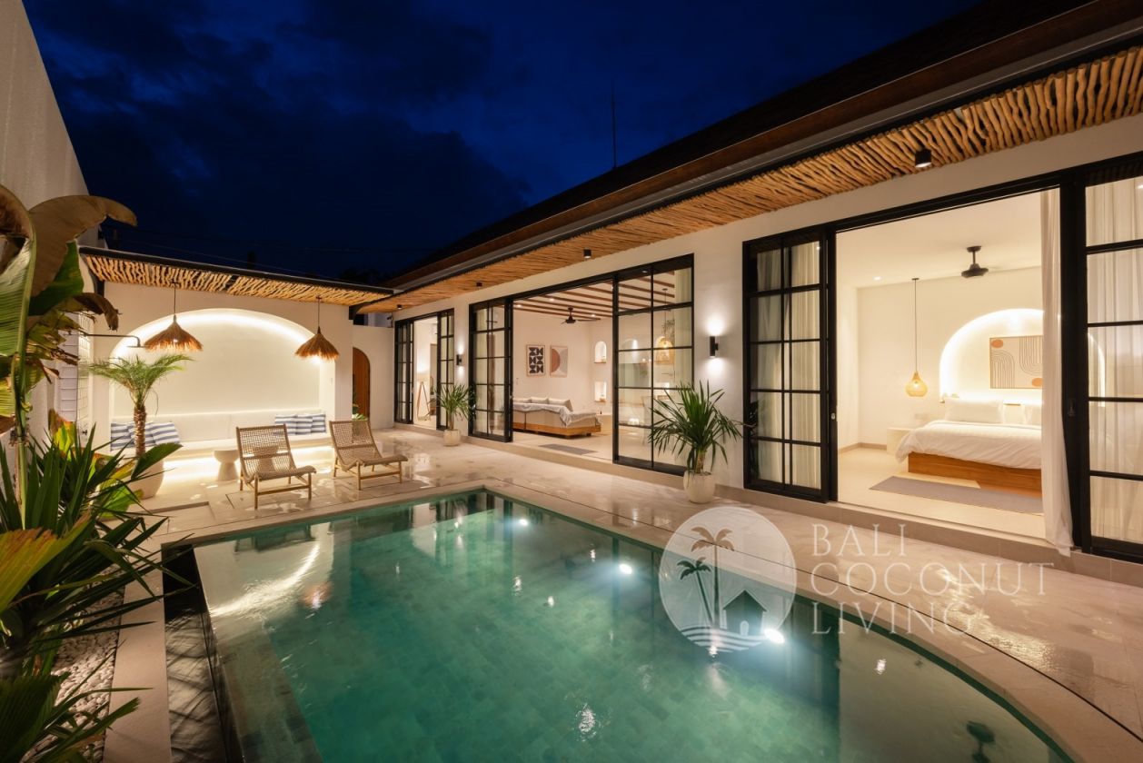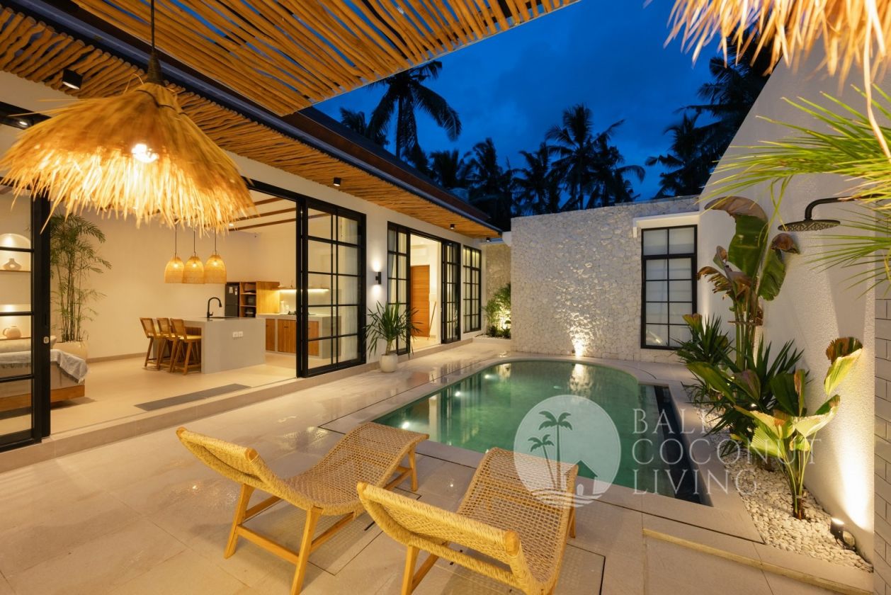 This stylish villa offers the perfect blend of comfort and modern living, located in the peaceful area of Tumbak Bayuh, just minutes away from the vibrant lifestyle of Canggu. Featuring 2 bedrooms with en-suite bathrooms, the villa is designed with a bright and airy layout, seamlessly connecting indoor and outdoor spaces. The enclosed living area opens directly to a private swimming pool with a
