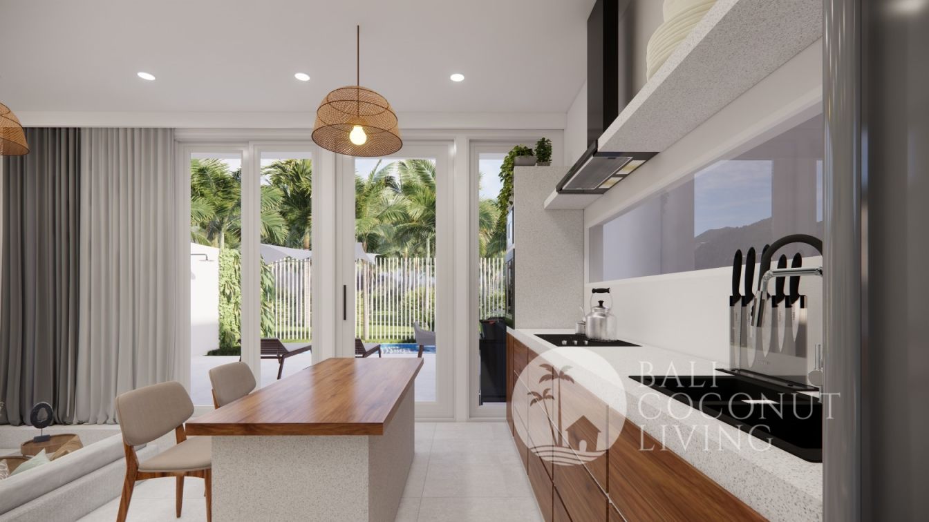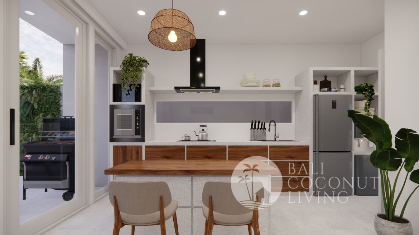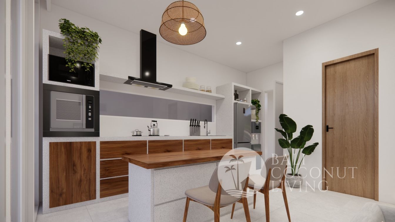 This stunning 2 bedroom villa is located in the beautiful and peaceful village of Kayu Tulang, just a short drive from the bustling Canggu central. The property sits on a spacious 100 sqm of land and boasts a modern and stylish design with high-end finishes and fixtures throughout. The enclosed living and dining area is flooded with natural light. The fully equipped kitchen features top-of-the-lin