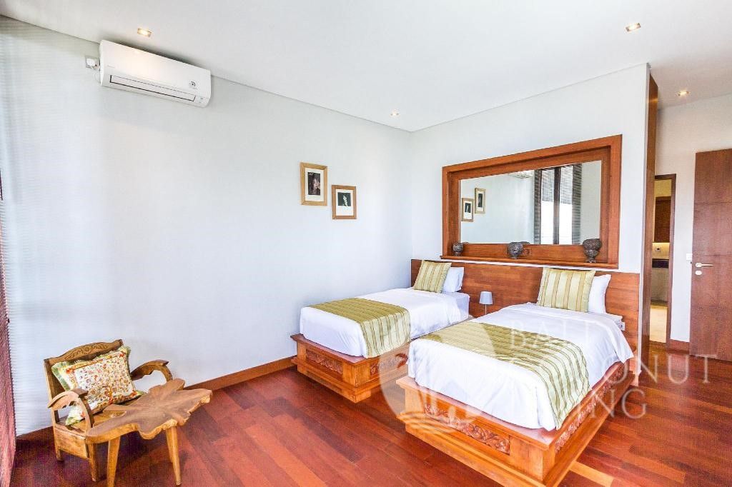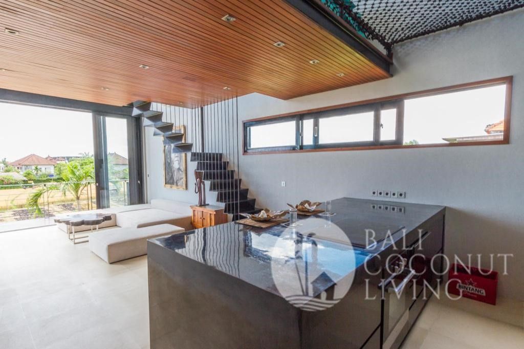 A luxurious 4 + 1 bedroom villa situated in a calm residential area of Umalas is available for sale. Set in a generous 410 sqm block of land with 600 sqm of building. The house features a mezzanine bedroom with en-suite bathroom and another 2 en-suite bedrooms on the 1st floor, 2 en-suite bedrooms, fully equipped kitchen adjacent to the Livingroom and balcony on the 2nd floor, and on the 3rd floor there are another mezzanine can be converted as cinema room with bathroom and access to the rooftop with increasable rice field views .