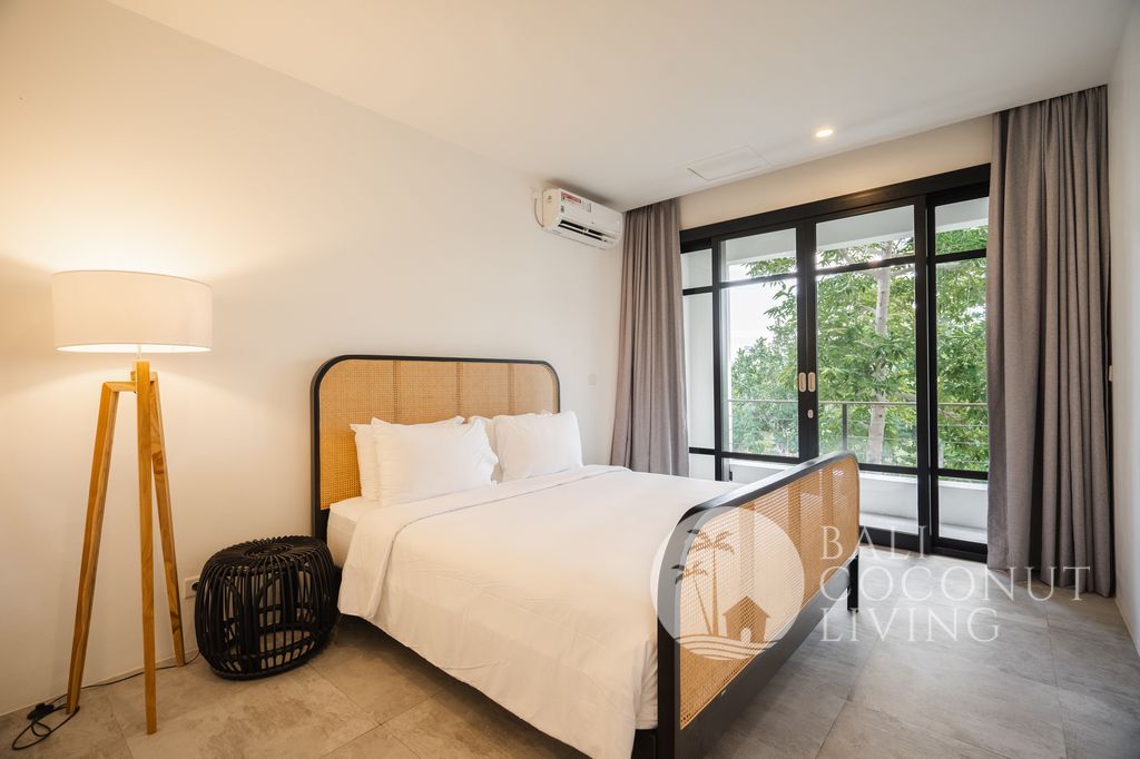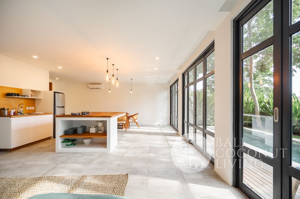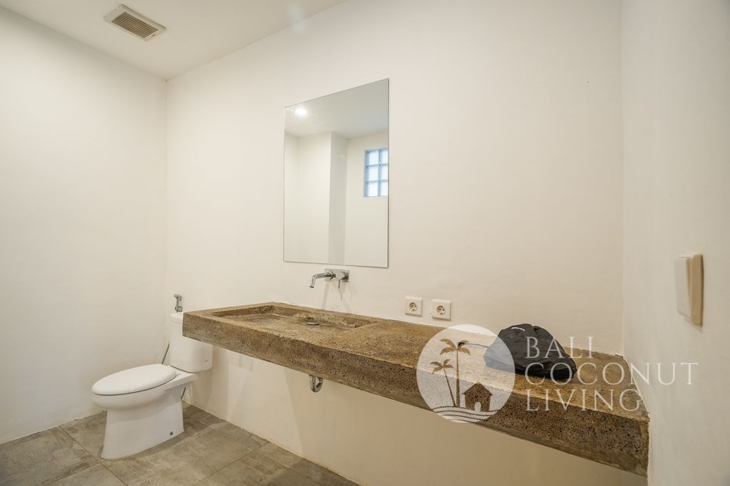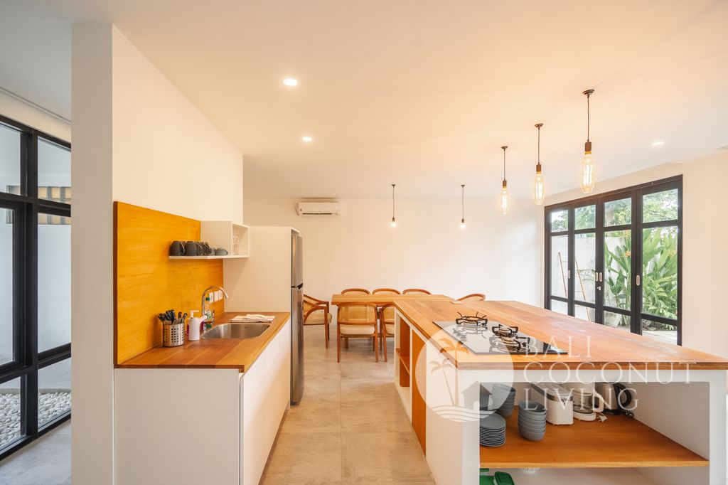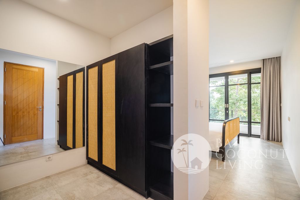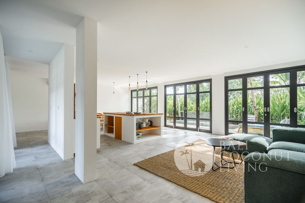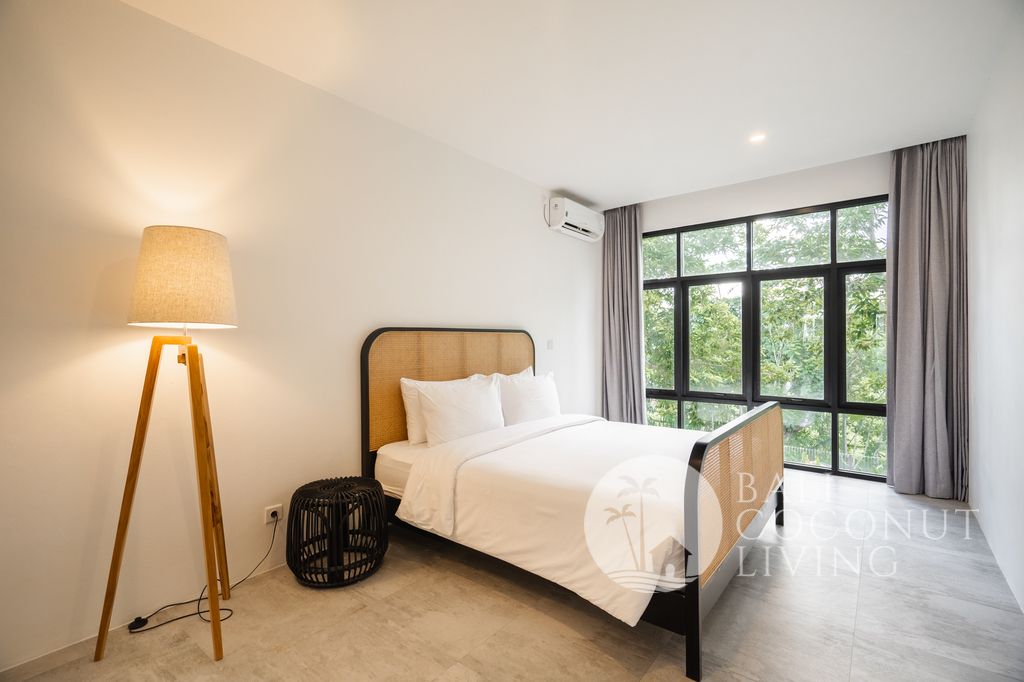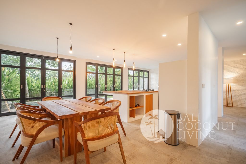 This elegant two-storey villa in Cemagi offers a comfortable living experience surrounded by a peaceful environment. The villa consists of two bright bedrooms with large arched windows that allow plenty of natural light, each equipped with ensuite bathrooms featuring modern fittings and a sleek design. The enclosed living and dining area connects to a kitchen finished with black marble countert
