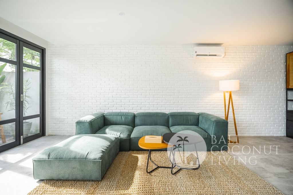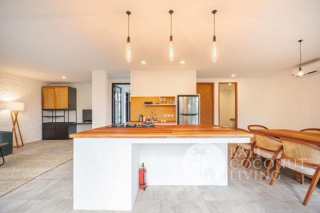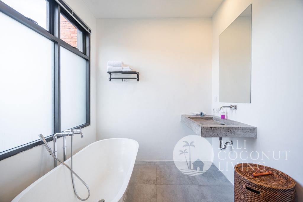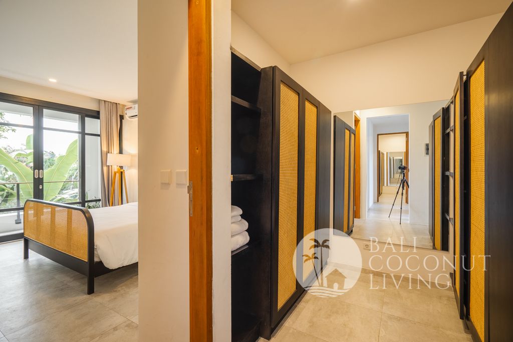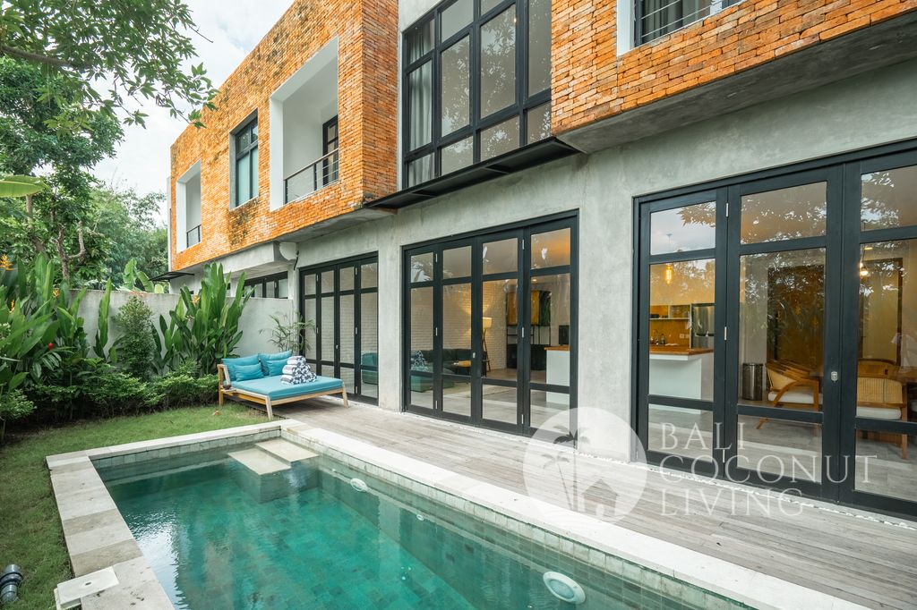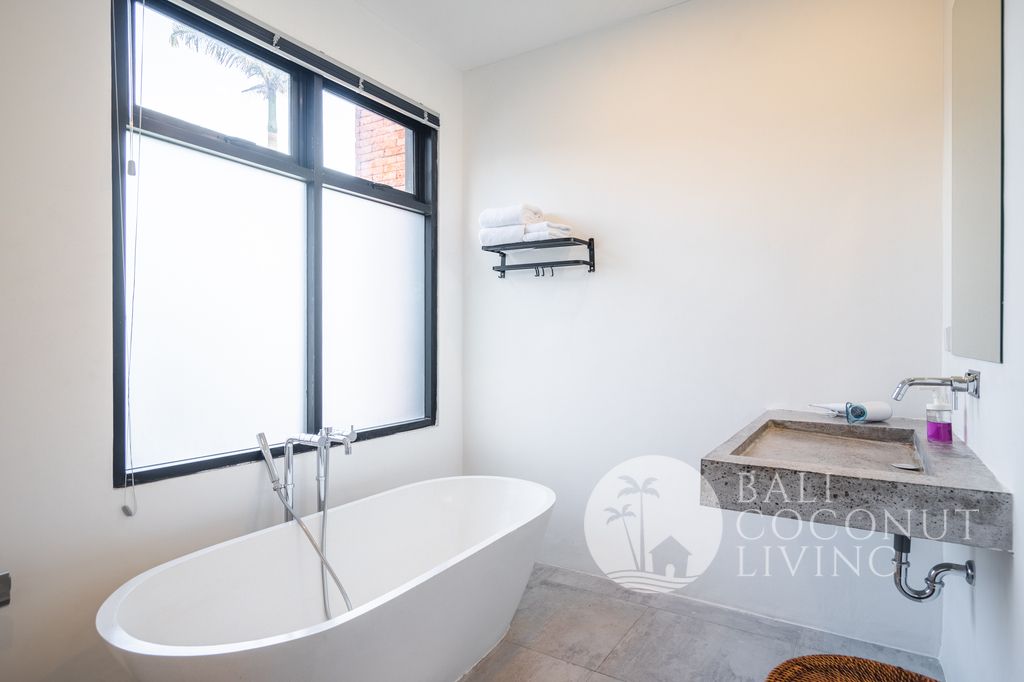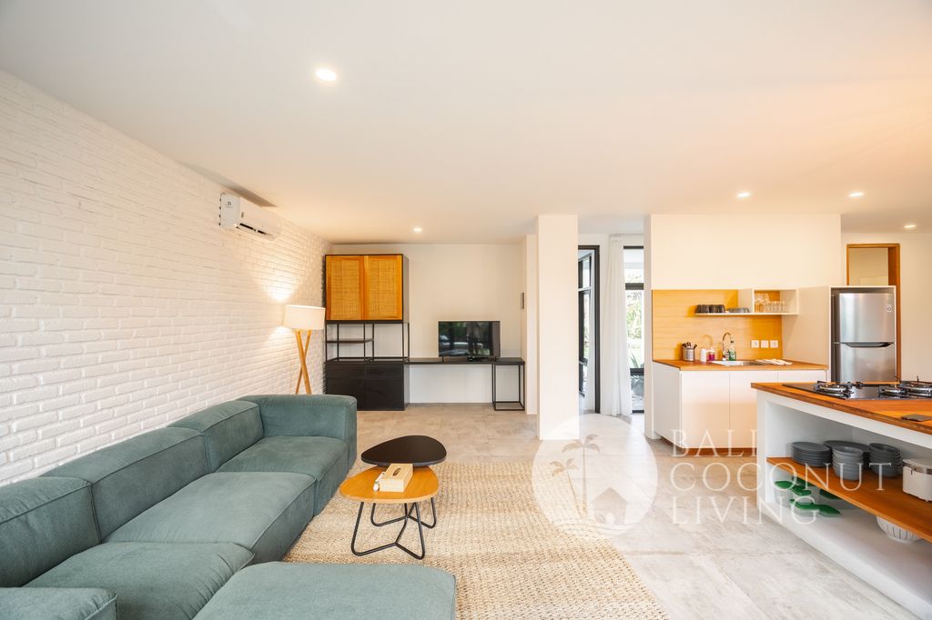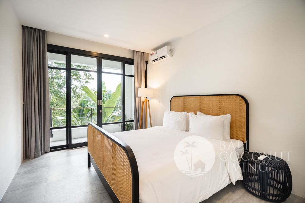 This elegant two-storey villa in Cemagi offers a comfortable living experience surrounded by a peaceful environment. The villa consists of two bright bedrooms with large arched windows that allow plenty of natural light, each equipped with ensuite bathrooms featuring modern fittings and a sleek design. The enclosed living and dining area connects to a kitchen finished with black marble countert