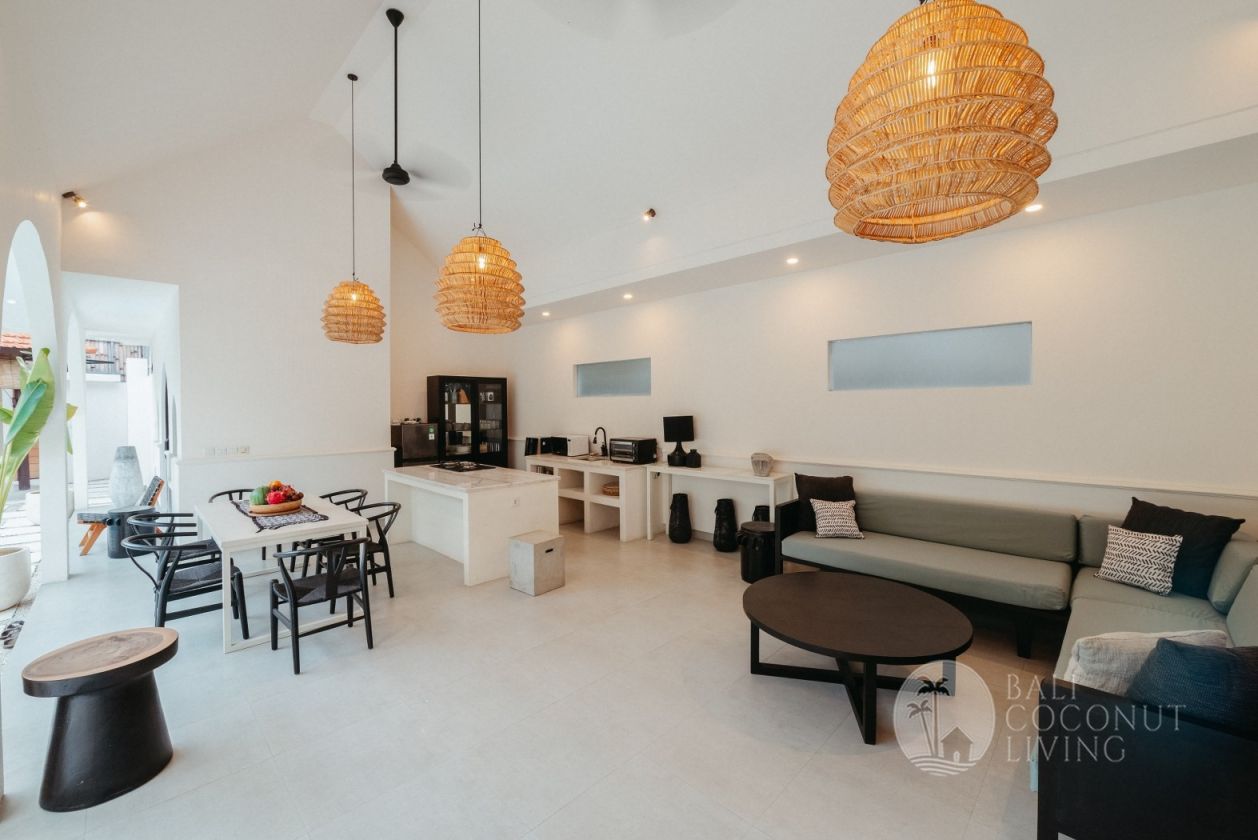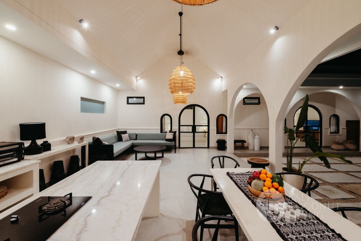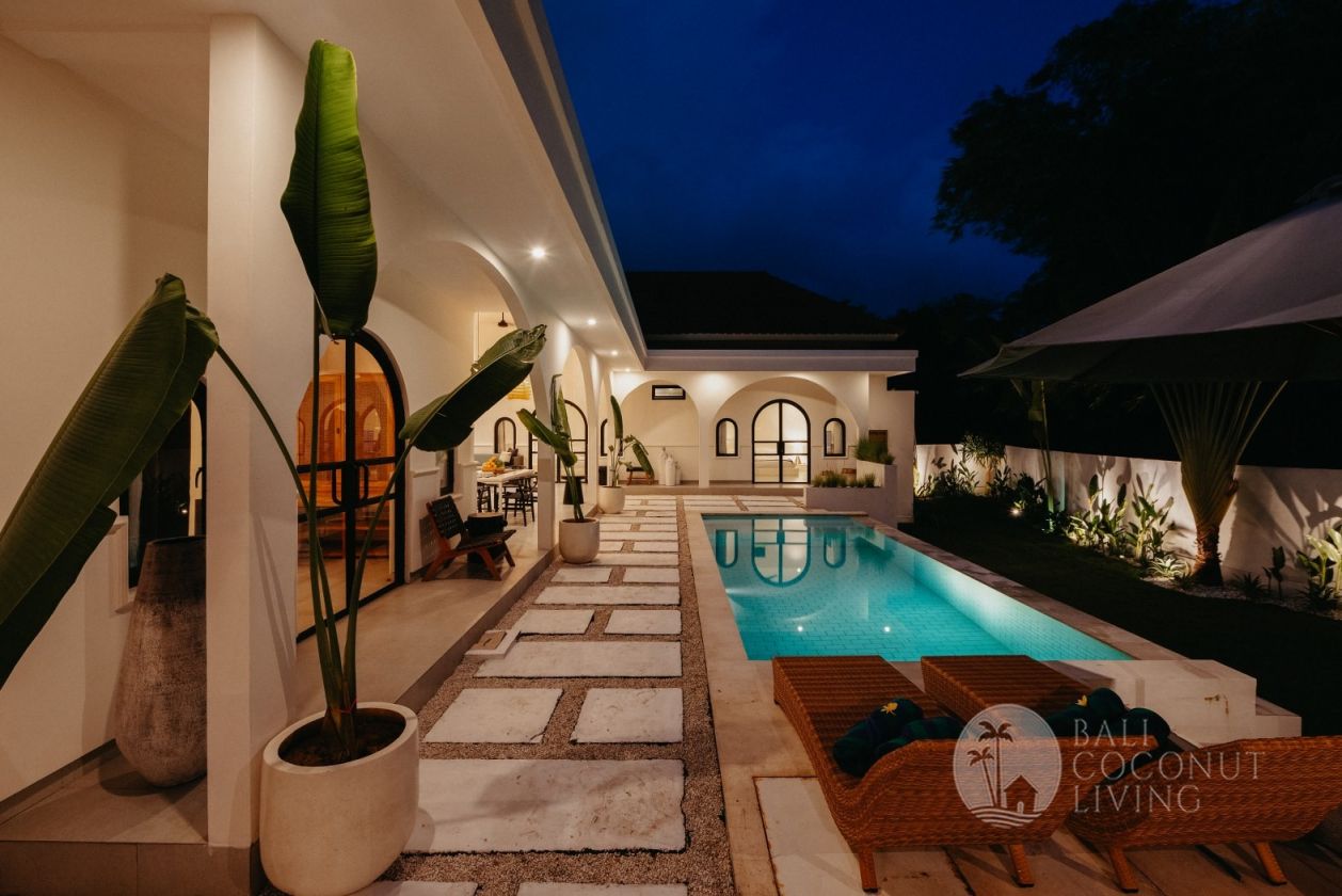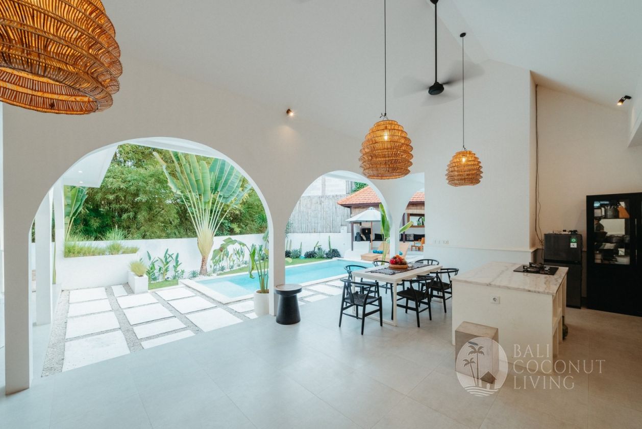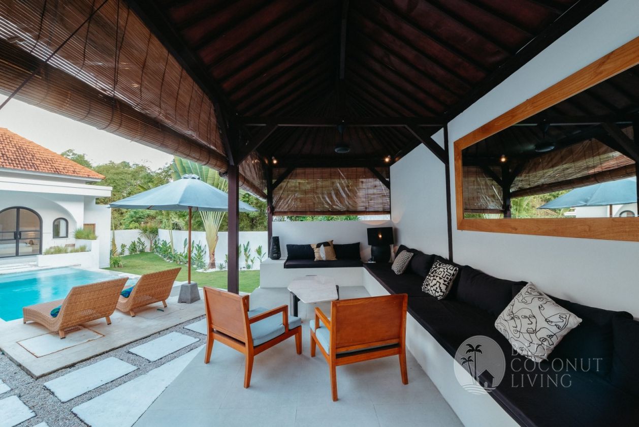 This elegant modern villa offers the perfect balance between tropical vibes and contemporary comfort. Designed with a closed living area, it ensures privacy and comfort while keeping the space bright and airy through wide glass doors overlooking the pool. Featuring 3 spacious bedrooms with ensuite bathrooms, a kitchen with warm wooden finishes, and a stylish living room that creates a cozy and