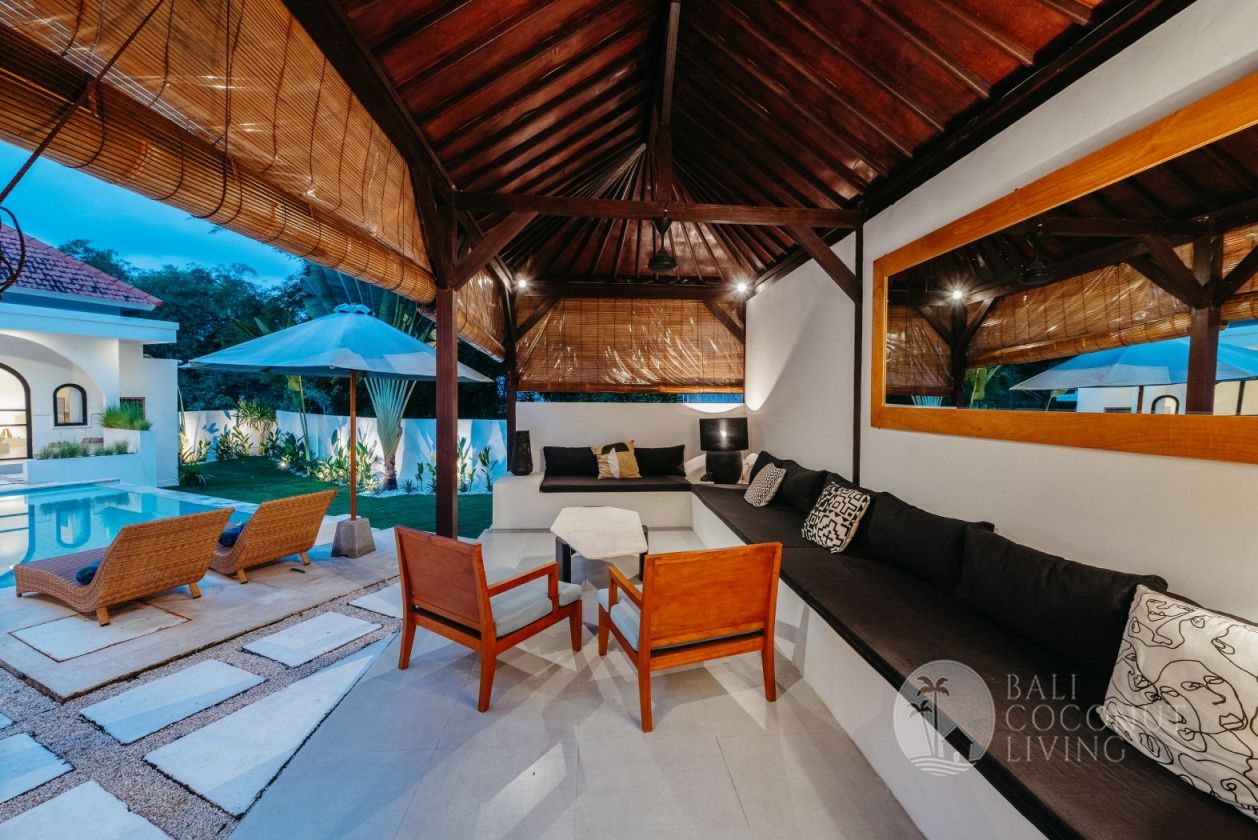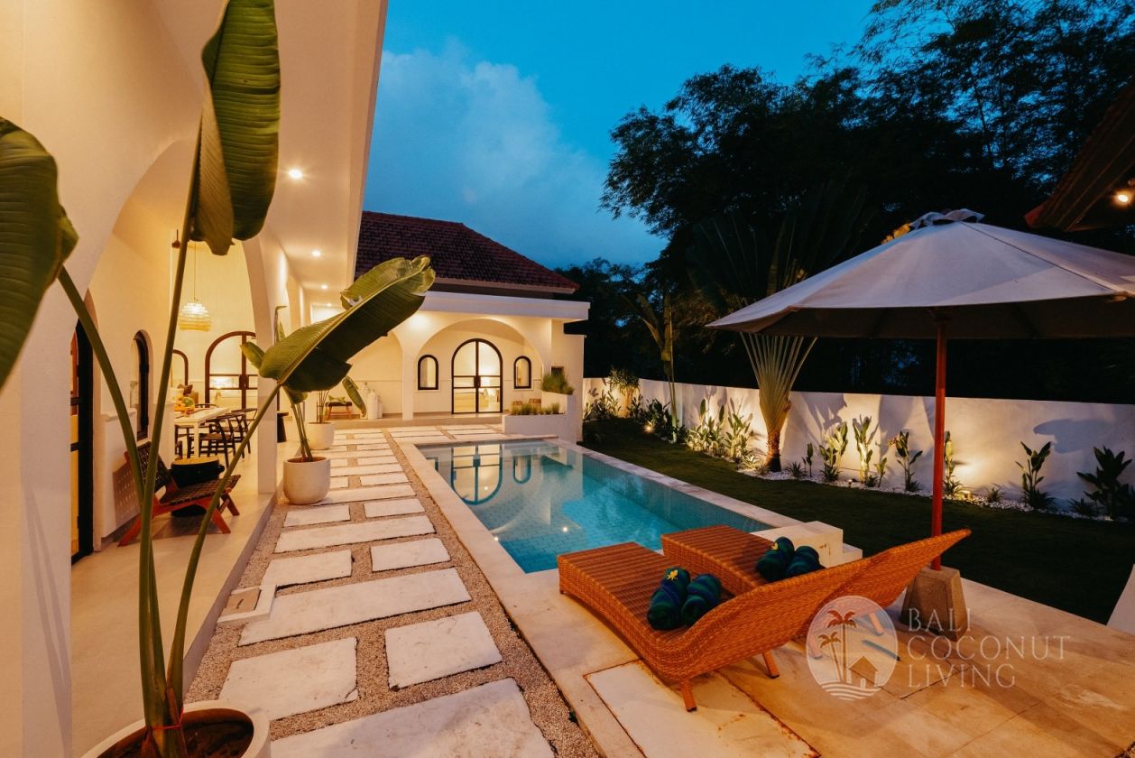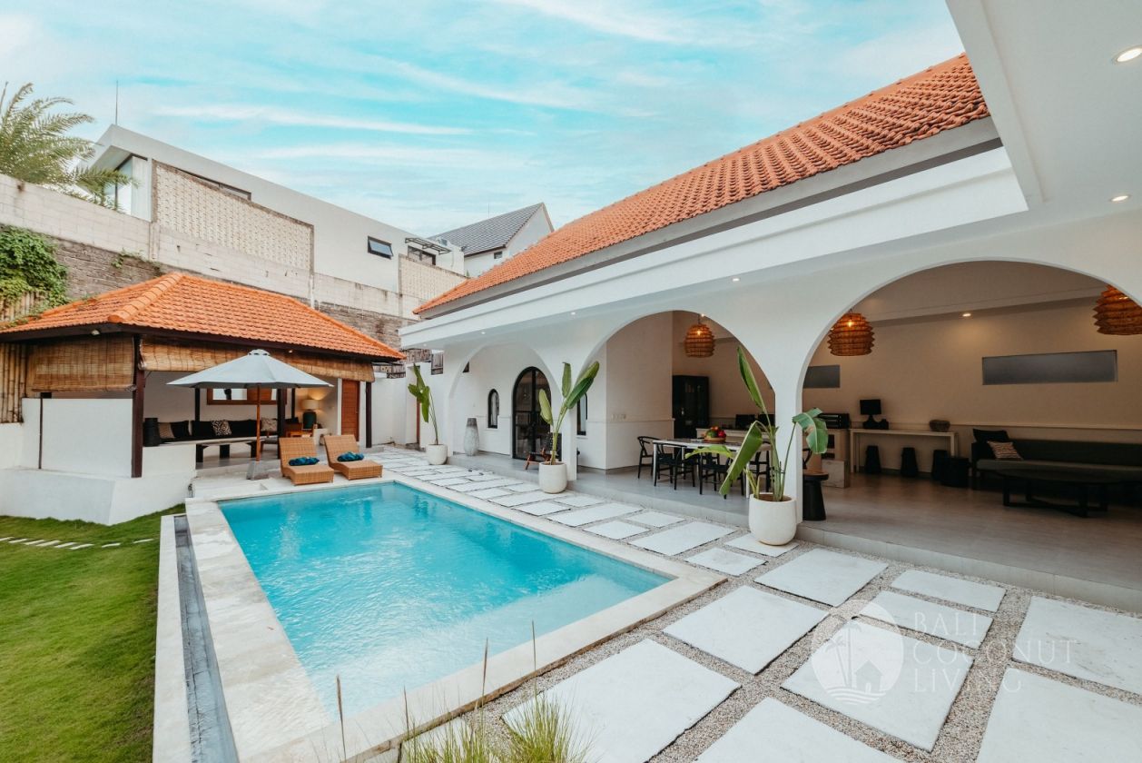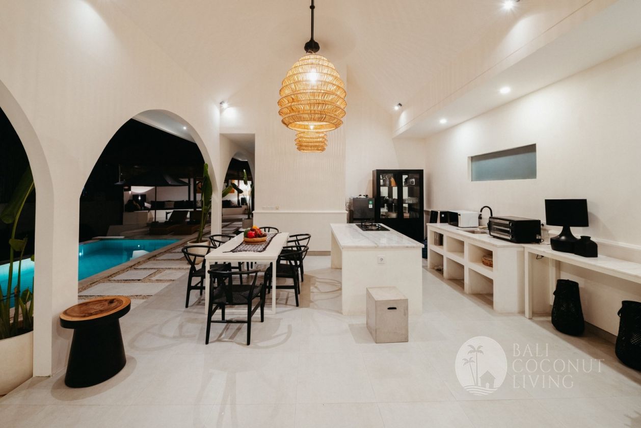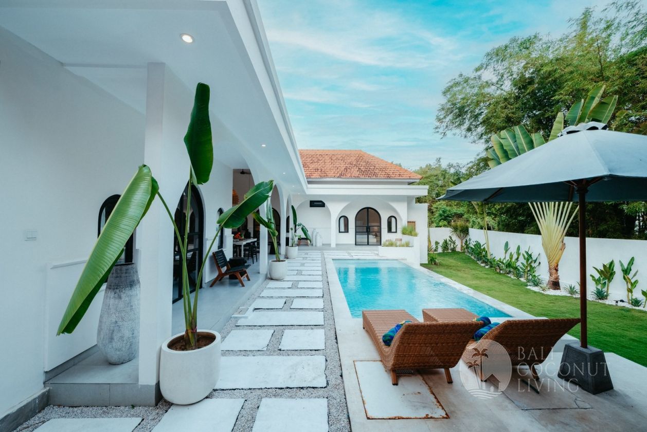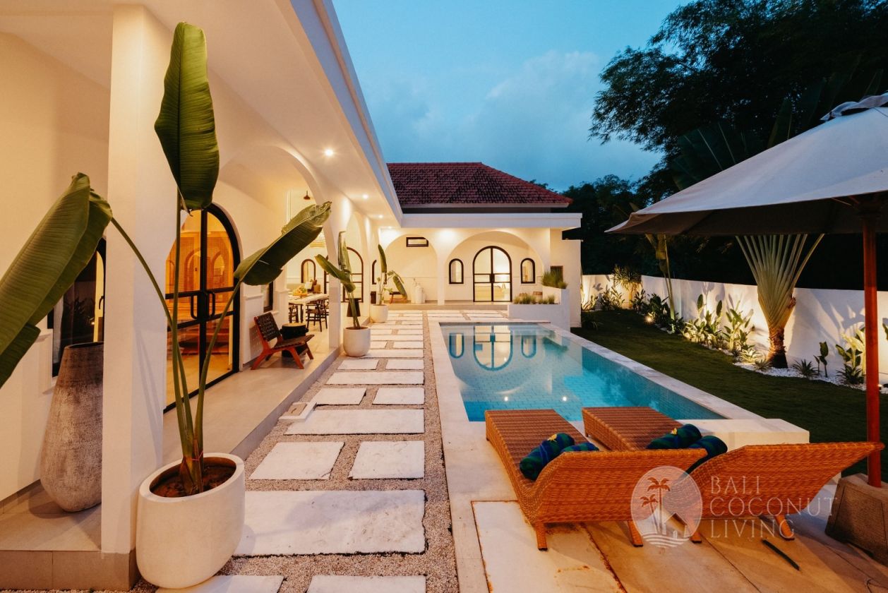 This elegant modern villa offers the perfect balance between tropical vibes and contemporary comfort. Designed with a closed living area, it ensures privacy and comfort while keeping the space bright and airy through wide glass doors overlooking the pool. Featuring 3 spacious bedrooms with ensuite bathrooms, a kitchen with warm wooden finishes, and a stylish living room that creates a cozy and