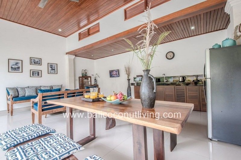 A beautiful 2 bedrooms villa nestled in a nice rural area in Kerobokan is now available. This villa sits on 220 sqm of land size and comprises of 2 en-suite bedrooms, open plan kitchen, open dining and living area, pool, garden, nice pool, and parking space. The dining table is set by the kitchen and conveniently let you enjoy the meal while overlooking the swimming pool and the lush garden.