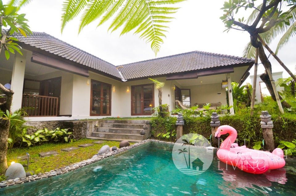 A cozy 2 bedroom villa located in a lovely area of Ubud is available for yearly rental. Set on 750 sqm of land size. The house consisting of 2 en-suite bedrooms, a guest toilet, a closed dining room, equipped kitchen, an open living/Terrace, a pool garden, and parking space.
